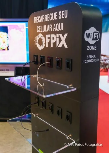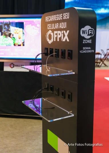 o convidado pode plugar o seu próprio carregador em uma das tomadas do chargepix ou utilizar os cabos existentes no totem para carregar seu celular iphone ou qualquer celular que possua o sistema operacional android. Além disso, o equipamento possuí conexão 4g fornecendo rede wifi grátis para todos os seus convidados em qualquer formato de evento.