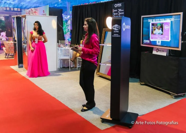 O CONVIDADO É ATRAÍDO PELAS BELAS ANIMAÇÕES EXIBIDAS NO ESPELHO MÁGICO. AO SE APROXIMAR, ELE É CONVIDADO A TOCÁ-LO E, QUANDO O FAZ, A DIVERSÃO COMEÇA E O ESPELHO O CONDUZ A TIRAR UMA SEQUÊNCIA DE FOTOS QUE SÃO IMPRESSAS NA HORA EM ALTA QUALIDADE E AINDA PODEM SER POSTADAS NAS REDES SOCIAIS.